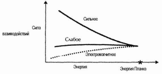 Однако струнная теория решает все эти противоречивые математические проблемы при помощи самой мощной симметрии из когда-либо обнаруженных в физике — суперсимметрии. В настоящее время суперсимметрия представляет собой единственный способ, которым можно обойти теорему Коулмена — Мандулы. (Суперсимметрия пользуется маленькой, но чрезвычайно важной брешью в этой теореме. Обычно когда мы вводим числа, такие, как а и Ь, мы предполагаем, что а х b = b х а. Это по умолчанию предполагалось в теореме Коулмена — Мандулы. Но в суперсимметрии мы вводим «суперчисла», такие, для которых а х b = — b х а. Эти суперчисла обладают весьма причудливыми свойствами. Например, если а х а = 0, то тогда а может быть не нулем, что звучит нелепо для случая с обычными числами. Если мы подставим суперчисла в теорему Коулмена — Мандулы, то обнаружим, что она больше не работает.) 13. Во-первых, она решает проблему иерархии, которая обрекает на поражение ТВО. При построении единых теорий поля мы приходим к двум серьезно отличающимся шкалам масс. Некоторые из частиц, например протон, обладают той же массой, что и в повседневной жизни. Однако другие частицы довольно массивны и обладают энергиями, сравнимыми с теми, которые можно было обнаружить в момент Большого Взрыва, с энергией Планка. Эти две шкалы масс необходимо разделять. Из-за квантовых флуктуации эти два типа масс начинают смешиваться, поскольку существует конечная вероятность того, что один набор легких частиц превратится в другой набор тяжелых частиц, и наоборот. Это означает, что должен существовать континуум частиц с массами, плавно изменяющимися от привычных нам масс до невероятно больших, которые были характерны для момента Большого Взрыва и которых мы не видим в природе. Здесь вступает суперсимметрия.