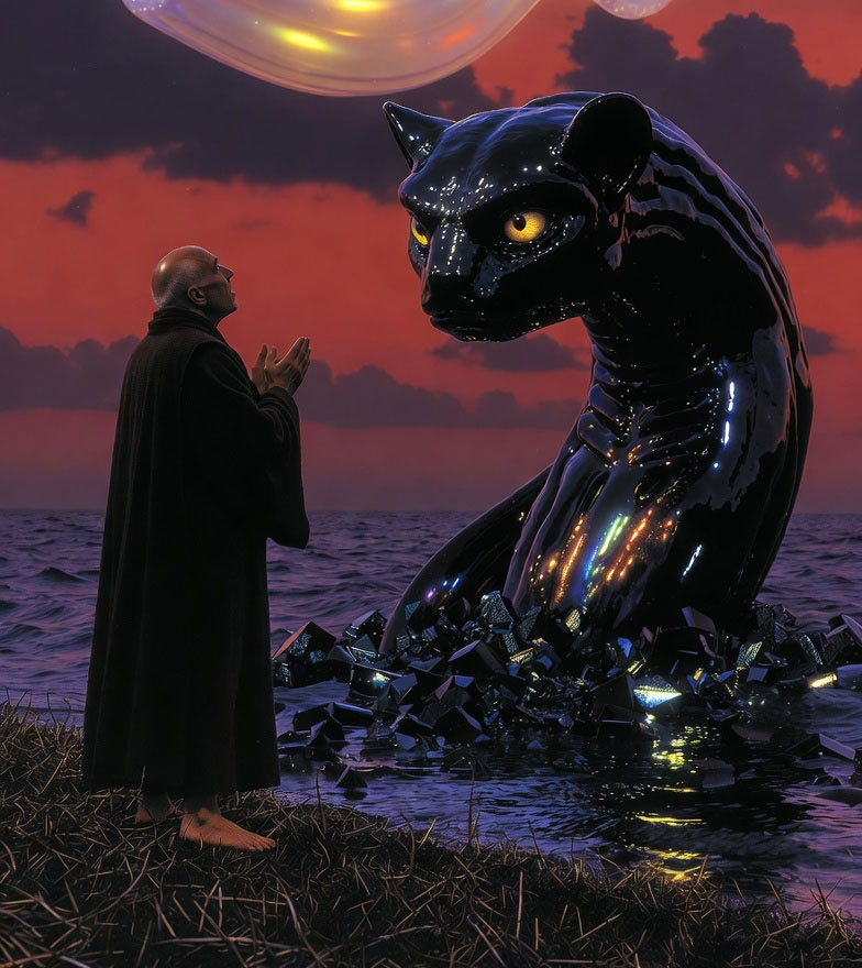 Что-то вроде звука отрыжки заставило его повернуться, и узретое подкосило колени: лоснящаяся чернотой масса гигантского тела, с чудовищной красотой постоянно меняющего очертания, имела более стабильный вырост в виде головы со что-то жующей кровавой пастью и прожекторами глаз с нестерпимо желтыми зрачками. И эти зрачки легко пронзали душу всепониманием.