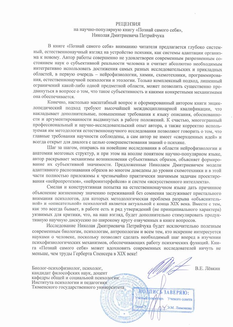 Отношение рецензента к содержанию книги Н.Д. Петрийчука «Познай самого себя» представлено ниже в двух разделах – «Достоинства книги» и «Замечания и пожелания».