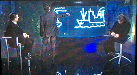 Поскольку Саша видит левым глазом, то чтобы увидеть изображение сквозь щель, ему нужно встать так, чтобы изображение оказалось справа от него. Только в этом случае у него заработает его "биокомпьютер". Получается странное зрелище - правой рукой указывает в одну сторону, а голову поворачивает в другую. Неудобно всё-таки... |