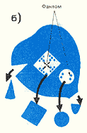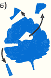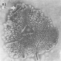 | Рис. 4. Фантомный эффект на листе фиалки (а), у которого по схеме (б) удалены фрагменты. Видны фантомы волосков листа — то есть конкретные анатомические структуры |