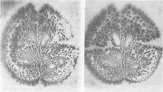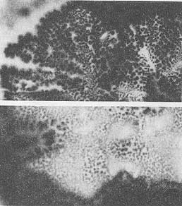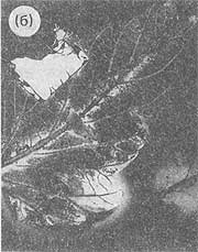 Поставив серию экспериментов с использованием специальных фотопластинок для ядерных исследований, мы убедились, что целые листья слабо излучают в темноте и засвечивают пластинки даже если между фотослоем и объектом помещены тонкие прокладки слюды. При этом образуются изображения с мельчайшими деталями строения (правда, не в любое время года). Самое же главное то, что в ряде случаев на местах отрезанных частей образовались настоящие фантомы (рис. 6).