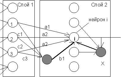 Пресинаптические тормозящие нейроны имеют ту же область связей, что и рассматриваемый возбуждающий постсинаптический нейрон i. При этом веса таких тормозящих нейронов (c1, c2 и c3) являются заданными и не изменяются при обучении. Их сумма равна единице, таким образом, выход тормозного пресинаптического нейрона равен средней активности возбуждающих пресинаптических нейронов в области связей:
