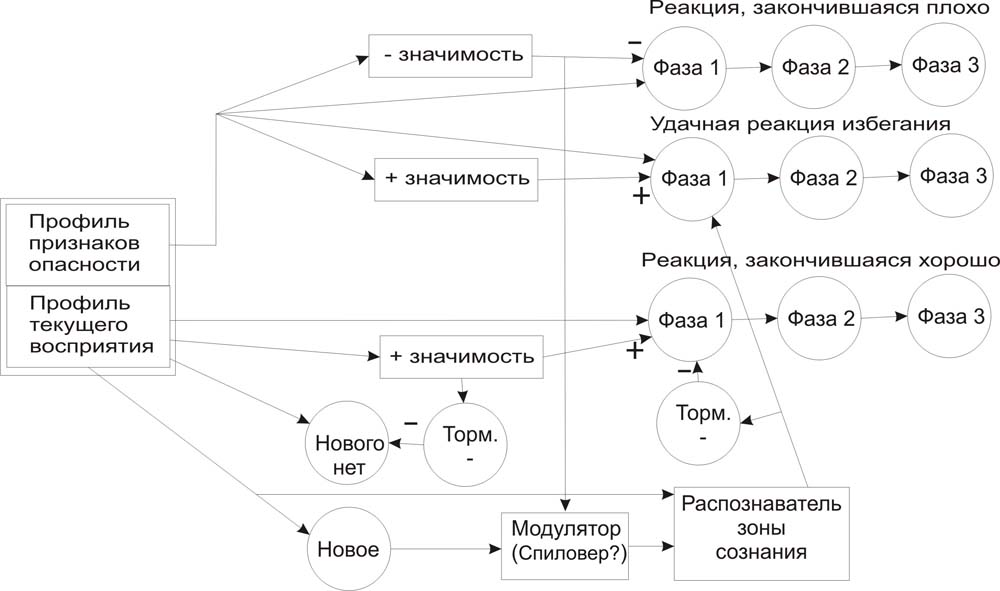 Здесь срабатывает детектор нового потому, что в общем профиле восприятия появился дополнительный элемент, но еще нет отношения к такому сочетанию системы значимости. Однако, признаки опасности оцениваются старым распознавателем системы значимости. Высокая отрицательная значимость при новизне - сигнал того. что нужно приостановить текущую фазу реакции и заменить ее на ту известную, которая уже сформирована прежним опытом для такой опасности. После чего результат такой модифицированной реакции оценивается и фиксируется уже для обобщенного профиля, который, тем самым, становится уже не новым и в последствии при его повторении не потребует вмешательства сознания, что может быть показано следующей схемой: