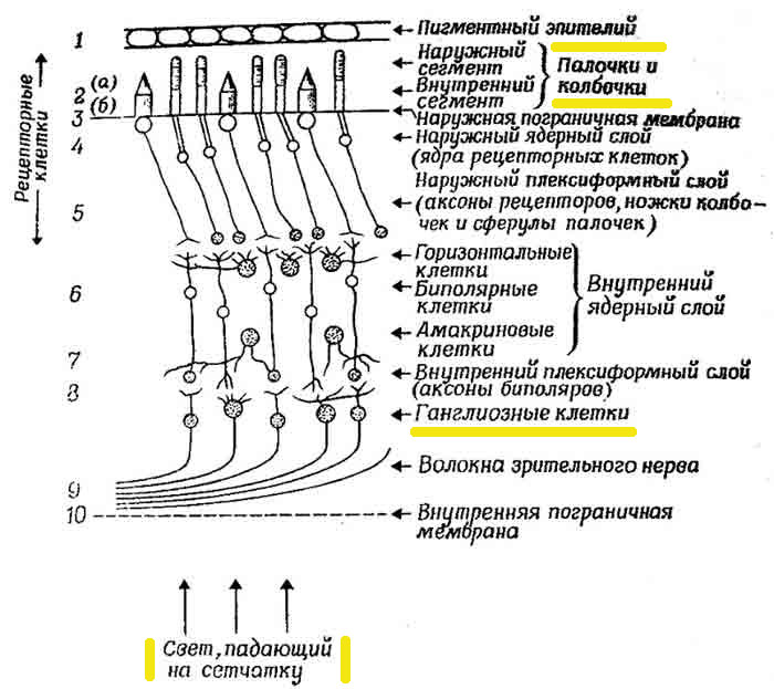 Поля ганглиозной клетки. Промежуточные слои клеток - горизонтальные, биполярные, амакриновые.