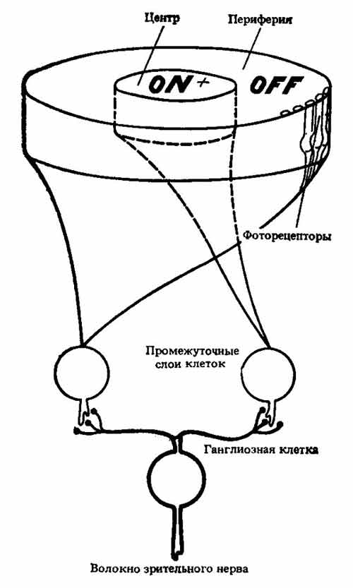 Ведущим для всех уровней зрительной системы является принцип полей. Полем называется группа фоторецепторов, «подключенных» к одной ганглиозной клетке.
