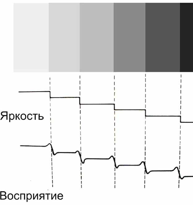Каждый прямоугольник имеет одинаковую по площади яркость, поэтому кривая яркости имеет ступенчатую форму (это можно проверить, перекрыв листами бумаги соседние прямоугольники). Однако узкая полоска слева от каждой границы кажется более светлой, а справа - более темной.