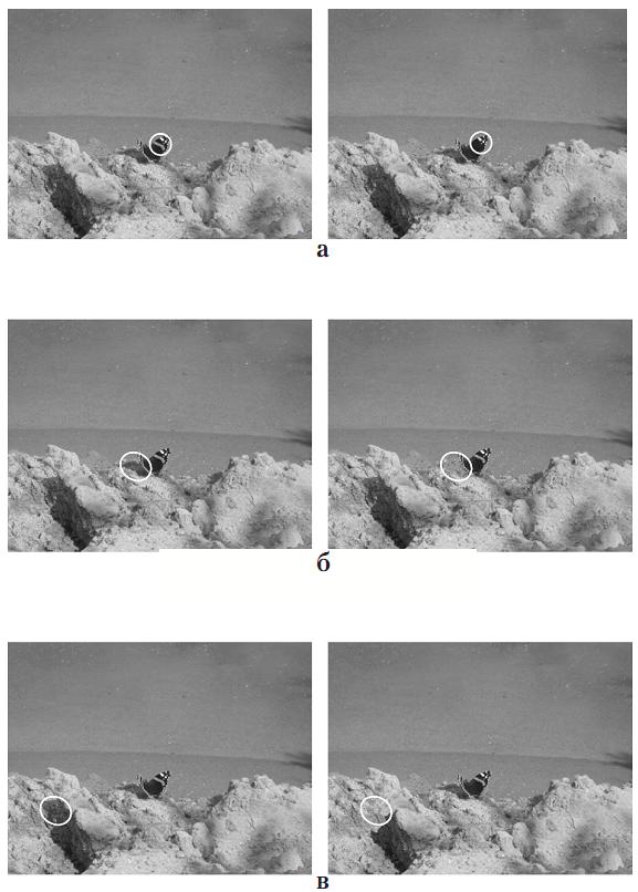 Для каждого из 12 изображений было сделано по три модификации в зависимости от тестируемого места изменений. Изменение могло происходить: 1) с главным объектом (или наиболее привлекательной его частью, если весь объект занимал большую площадь на экра­не), 2) с второстепенным объектом вблизи главного и 3) с второстепенным объектом вдали от главного. Соответственно, три типа изменений были названы нами: 1) центральными (поскольку главный объект рассматривался как система отсчета), 2) ближними и 3) даль­ними. Пример всех типов изменений представлен на рис. 1. К сожалению, уравнять второ­степенные и главные изменения по перцептивным и тем более семантическим характери­стикам оказалось невозможным, поскольку зачастую эти характеристики и определяли ста­тус объекта – главный он или второстепенный2. Однако для ближних и дальних изменений такое уравнивание было сделано: на соответствующих модификациях одного изображения изменению подвергаются сходные объекты, приблизительно равные по угловому размеру, яркости и цвету. Например, на рис. 1 в качестве ближнего меняющегося объекта выступает исчезающая тень на песке от бабочки, а в качестве дальнего – такая же по площади часть тени от песчаной горки.