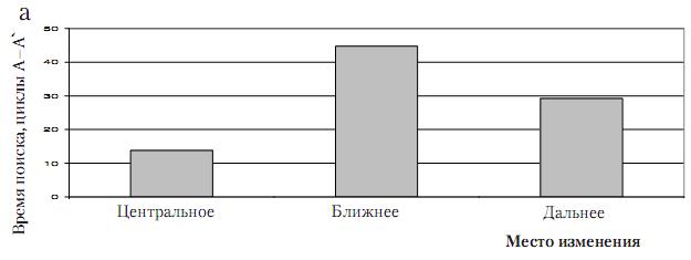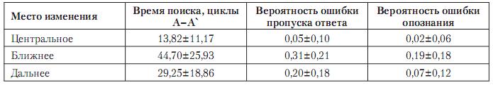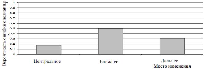 Дисперсионный анализ с повторными измерениями показал, что существуют значи­мые различия между тремя условиями предъявления изменений для времени поиска из­менений (F(2,53)=74,90, p<0,001), вероятности ошибки пропуска (F(2,53)=31,11, p<0,001) и вероятности ошибки опознания (F(2,53)=21,99, p<0,001). Дополнительная проверка с помощью апостериорных тестов показала, что значимыми являются все парные различия между условиями. Как видно из табл. 1 и рис. 3, центральные изменения в целом обнаружи­ваются быстрее и чаще и опознаются точнее, чем периферические, при этом среди перифе­рических изменений по всем показателям преимущество имеют дальние.
