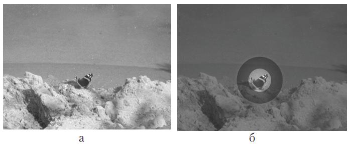 Рис. 5. Гипотетическая схема уделения внимания частям зрительной сцены относительно централь­ного объекта: а – исходное изображение; б – изображение, графически демонстрирующее фокус, перифе­рию и «мертвую зону» внимания.