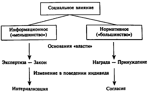Дальнейшие исследования феномена конформности привели к выводу о том, что давление на индивида может оказывать не только большинство группы, но и меньшинство. Соответственно М.Дойчем и Г.Джерардом были выделены два вида группового влияния: нормативное (когда давление оказывает большинство, и его мнение воспринимается членом группы как норма) и информационное (когда давление оказывает меньшинство, и член группы рассматривает его мнение лишь как информацию, на основе которой он должен сам осуществить свой выбор) (рис. 12).Таким образом, проблема влияния большинства и меньшинства, проанализированная С.Московичи, имеет большое значение и в контексте малой группы.