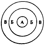 Все сказанное имеет непосредственное отношение к пониманию сплоченности группы. Эта характеристика предстает здесь как определенный процесс развития внутригрупповых связей, соответствующий развитию групповой деятельности. Три слоя групповых структур могут одновременно быть рассмотрены и как три уровня развития группы, в частности, три уровня развития групповой сплоченности (рис. 13). На первом уровне (что соответствует поверхностному слою внутригрупповых отношений) сплоченность действительно выражается развитием эмоциональных контактов (В). На втором уровне (что соответствует второму слою ЦОЕ) происходит дальнейшее сплочение группы, и теперь это выражается в совпадении у членов группы основной системы ценностей, связанных с процессом совместной деятельности (Б). На третьем уровне (что соответствует "ядерному" слою внутригрупповых отношений) интеграция группы (а значит, и ее сплоченность) проявляется в том, что все члены группы начинают разделять общие цели групповой деятельности (А).