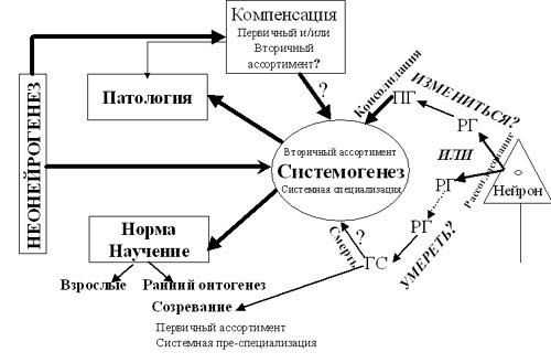 Неонейрогенез может иметь значение и для замены нейронов первичного и/или вторичного ассортиментов, гибнущих как в условиях нормы, так и при патологии (см. ниже). Что касается патологии, в литературе уже имеются данные об интенсификации неонейрогенеза при локальных поражениях мозга взрослых индивидов и о миграции вновь появившихся нейронов в область повреждения [163]. Знаки вопроса на рис. 2 (внутри фрагмента Компенсация и у стрелки, идущей от него) означают, что в настоящее время трудно сказать, какой именно ассортимент (или оба) подлежит восполнению, и каким образом мог бы меняться состав ранее специализировавшихся нейронов в том случае, если компенсация вторичного ассортимента имеет место.
