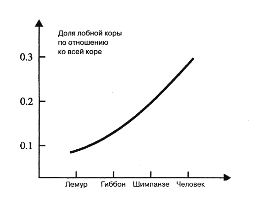 Рис. 4. 1. Пропорция лобных долей по отношению ко всему мозгу у разных видов приматов и обезьян |