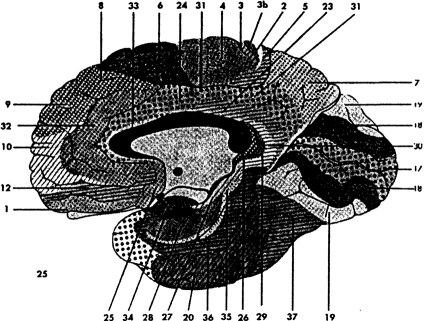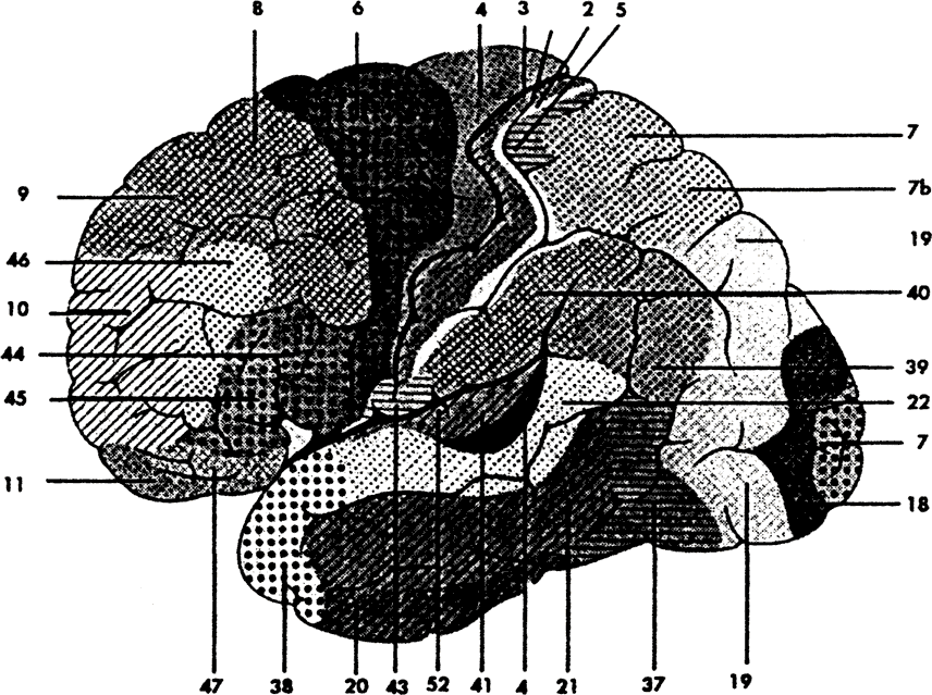 Рис. 4.2. Карта архитектонических зон коры по Бродману. (Адаптировано из Roberts, Leigh, Weinberger, 1993.) |
