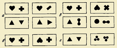 В целях выяснения возможностей дельфинов к переносу опыта было выбрано 12 пар фигур, которые дельфин различал в результате обучения; 10 пар других комбинаций тех же фигур предъявлялись дельфину в качестве новых тестовых задач для различения. В тестовых парах обе фигуры, только положительную или отрицательную, поворачивали на 90 или на 180°, а в ряде опытов заменяли на другие (рис. 1).