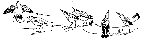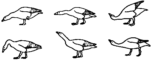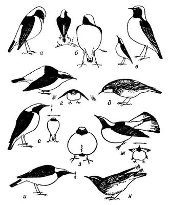 Этограмма сигнального поведения каменки-плешанки (Oenanthe pleschanka): а—г — различные формы территориального и угрожающего поведения самца, д — то же самки; е—и — брачное поведение самца, к — то же самки. Стрелки обозначают одно- или многократные движения головы и крыльев.