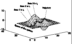 Для отображения систем и их динамики физик Уильям Гамильтон и математик Карл Якоб ввели понятие пространство состояний как необходимое для описания динамики физических систем.[5] Динамическая система обычно определяется в формальном пространстве, в котором задано топографическое многообразие (рисунок 1). Точка в формальном пространстве представляет состояние системы в данный момент. Каждая точка является структурным паттерном активности элементов (т.е. их компоновкой). Формальное пространство системы представляет все состояния системы, которые только можно представить (т.е. все возможные комбинации активности элементов). Такое формальное пространство иногда еще называют ландшафтом (рисунок 1). По мере изменения во времени динамического состояния системы, меняются комбинации активности элементов (т.е. меняются точки в пространстве). На языке пространства состояний динамика системы описывается как "движение" из одной точки ландшафта к следующей, определяя таким образом траекторию (или кривую) в формальном пространстве (Рисунок 1, состояния 1, 2 и 3 в моменты времени t1, t2 и t3).
