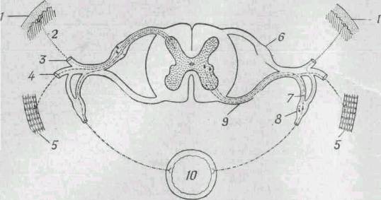 Для удобства чувствительные нейроны показаны на левой стороне, а двигательные - на правой, хотя на обеих сторонах тела имеются и те и другие. 1 - кожа; 2 - нервные волокна от кожных рецепторов; 3 - задняя ветвь; 4 - передняя ветвь; 5 - скелетная мышца; 6 - ганглий заднего корешка; 7 - вегетативная ветвь; 8 - симпатический ганглий; 9 - передний корешок; 10 - кишечник.