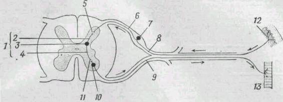 1 - вставочный нейрон; 2 - дендрит; 3 - тело нейрона; 4 - аксон; 5 - синапс между чувствительным и вставочным нейронами; 6 - аксон чувствительного нейрона; 7 - тело чувствительного нейрона; 8 - дендрит чувствительного нейрона; 9 - аксон двигательного нейрона; 10 - тедо двигательного нейрона; 11 - синапс между вставочными и двигательными нейронами; 12 - рецептор в коже; 13 - мышца.