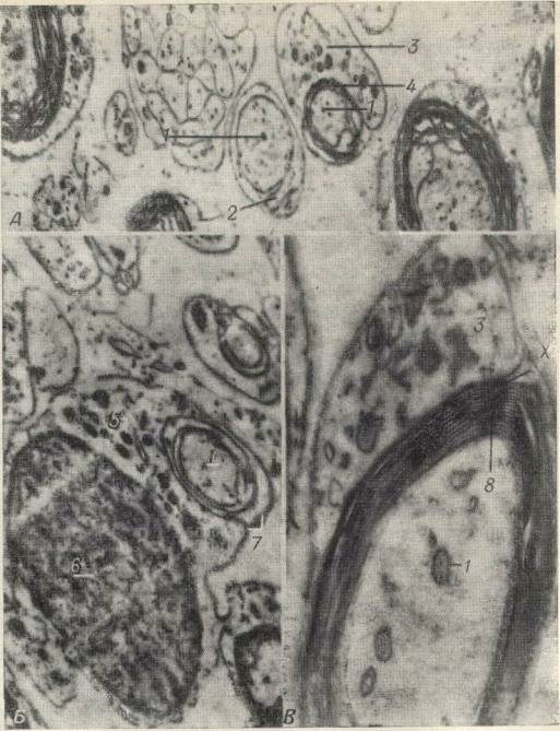 Рис. 264. электронные микрофотографии волокон седалищного нерва мышонка в возрасте 7 дней, показывающие развитие миэлиновой оболочки путем образования складок оболочками клеток неврилеммы.