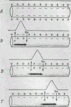 Б - Г. Стадии прохождения импульса по нерву; показана волна деполяризации и сопровождающий ее потенциал действия, распространяющийся по мембране.