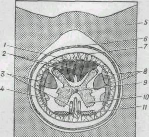 1 - мягкая мозговая оболочка; 2 - проводящие пути для импульсов мышечного чувства; 3 - проводящие пути для двигательных импульсов, идущих к мышцам; 4 - проводящие пути для импульсов от рецепторов боли, тепла и холода; 5 - костное кольцо, образованное невральной дугой позвонка; 6 - твердая мозговая оболочка; 7 - паутинная оболочка; 8 - проводящие пути к мозжечку для координации мышечной активности; 9 - центральный канал; 10 - серое вещество; 11 - проводящие пути для импульсов от рецепторов прикосновения и давления.