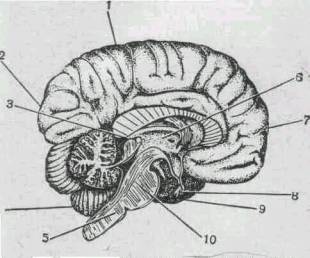 1 - теменная доля; 2 - затылочная доля; 3 - эпифиз 4 - мозжечок; 5 - продолговатым мозг; 6 - таламус 7 - лобная доля; 8 - гипофиз; 9 - височная доля 10 - средний мозг.