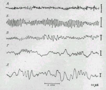 Электроэнцефалограммы человека, зарегистрированные при возбужденни, в спокойном состоянии и на различных зтапах сна.