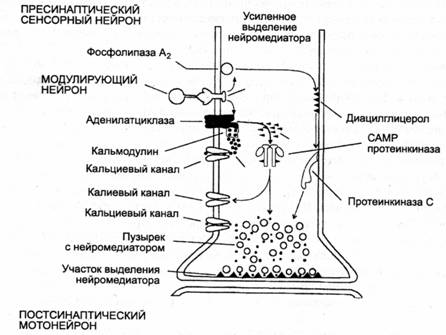 Модулирующие нейроны участвуют в процессе научения (см. главу 15), изменяя проводимость синапса на нресинаитическом уровне. Эффект пресинаптической пластичности, создаваемый модулирующими нейронами, может быть начальным звеном в цепи событий, приводящих к пластическом модификации поведения, связанной с выработкой условных рефлексов. Безусловное подкрепление как очень сильный раздражитель нейрона также возбуждает модулирующие нейроны и тем самым инициирует процесс иресинаптических изменений. За начальным этапом пластических изменений следует этан клеточных и молекулярных преобразований нейронов, характеризующий ассоциативное обучение.