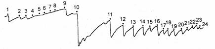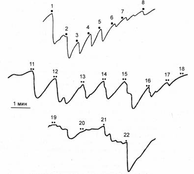 1-8 — индифферентные звуковые стимулы до инструкиии; 9 — инструкция. Видно, что усиление фазических КГР-реакиий сопровождается тоническим снижением сопротивления кожи, которое сохраняется до 24-го применения стимула. По оси ординат — сопротивление в кОм |по Е. Н. Соколову, 19581