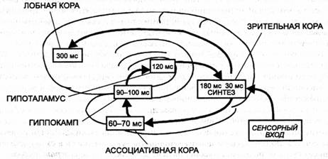 Другими словами, был сделан шаг к преодолению барьера между двумя уровнями организации мозговых процессов, один из которых не сопровождается, а другой сопровождается субъективными переживаниями. Согласно предложенной концепции, последовательное поступление информации от рецепторов приводит к повторному движению возбуждения но указанному кольцу, обеспечивая постоянное сопоставление сигналов, приходящих из внешней и внутренней среды, что и составляет психическии мониторинг происходящих изменении. сггот процесс осуществляется с периодом приблизительно в 150 мс, составляющим минимальную длительность ощущений. Позднее сходное кольцо возбуждения было описано М. Мишкиным у обезьян при анализе стимулыюй информации, образовании и извлечении памятных следов.