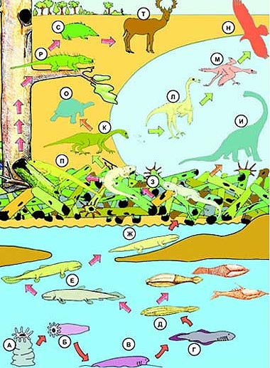 нервной системы называется памятью. В нервной системе объем памяти определяется числом нервных клеток, вовлекаемых в процесс запоминания. Чтобы запомнить хоть что-то, надо иметь примерно 100 компактно расположенных нейронов, как у актиний. Их память краткосрочна, неустойчива, но эффективна. Если собрать актиний и поместить в аквариум, то все они воспроизведут предыдущую природную ориентацию. Следовательно, каждая особь помнит, в каком направлении "смотрело" ее ротовое отверстие. Еще более сложное поведение актинии обнаружили в экспериментах по обучению. К одним и тем же щупальцам этих животных в течение 5 дней прикладывали несъедобные кусочки бумаги. Актинии сначала отправляли их в рот, проглатывали, а потом выбрасывали. Через 5 дней они перестали есть бумагу. Затем исследователи стали прикладывать бумажки к другим щупальцам. На этот раз животные прекратили поедание бумаги значительно быстрее, чем в первом эксперименте. Этот навык сохранялся в течение 6-10 дней. Такие эксперименты демонстрируют принципиальные отличия животных, обладающих памятью, от существ, не имеющих никаких способов сохранять информацию о внешнем мире и о себе. НЕРВНАЯ СИСТЕМА ПОСЛЕ ВЫХОДА ПОЗВОНОЧНЫХ НА СУШУ Роль нервной системы стала особенно значительной после выхода позвоночных на сушу, который поставил бывших первичноводных в крайне сложную ситуацию. Они прекрасно приспособились к жизни в водной среде, которая мало походила на наземные условия обитания. Новые требования к нервной системе были продиктованы низким сопротивлением среды, увеличением массы тела, хорошим распространением в воздухе запахов, звуков и электромагнитных волн. Гравитационное поле предъявило крайне жесткие требования к системе соматических рецепторов и к вестибулярному аппарату. Если в воде упасть невозможно, то на поверхности Земли такие неприятности неизбежны. На границе сред сформировались специфические органы движения - конечности. Резкое повышение требований к координации работы мускулатуры тела привело к интенсивному развитию сенсомоторных отделов спинного, заднего и продолговатого мозга. Дыхание в воздушной среде, изменение водно-солевого баланса и механизмов пищеварения обусловили развитие специфических систем контроля этих функций со стороны мозга и периферической нервной системы. В результате возросла общая масса периферической нервной системы за счет иннервации конечностей, формирования кожной чувствительности и черепно-мозговых нервов, контроля над органами дыхания. Кроме того, произошло увеличение размеров управляющего центра периферической нервной системы - спинного мозга. Сформировались специальные спинномозговые утолщения и специализированные центры управления движениями конечностей в заднем и продолговатом мозге. У крупных динозавров эти отделы превысили размеры головного мозга. Важно и то, что сам головной мозг стал крупнее. Увеличение его размеров вызвано повышением представительства в мозге анализаторов различных типов. В первую очередь это моторные, сенсомоторные, зрительные, слуховые и обонятельные центры. Дальнейшее развитие получила система связей между различными отделами мозга. Они стали основой для быстрого сравнения информации, поступающей от специализированных анализаторов. Параллельно развились внутренний реце