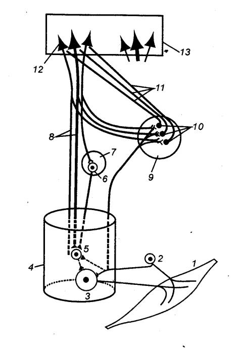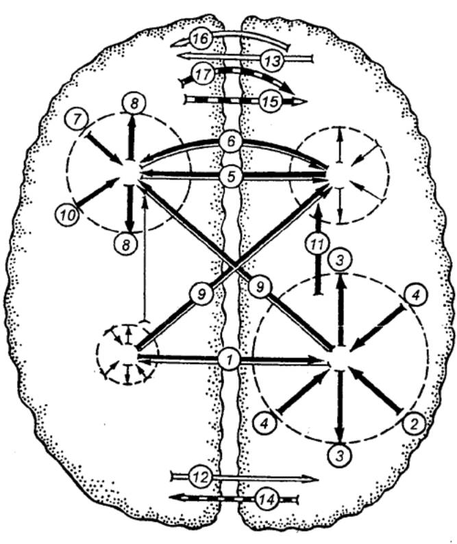 межзональные транскаллозальные влияния; 11 — межзональные внутриполушарные влияния; 12, 13 — транскаллозальные