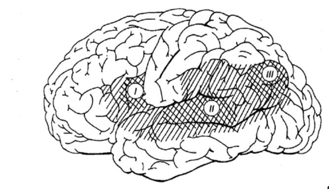 расположение моторного (зона Брока, I), слухового (зона Вернике, II) и