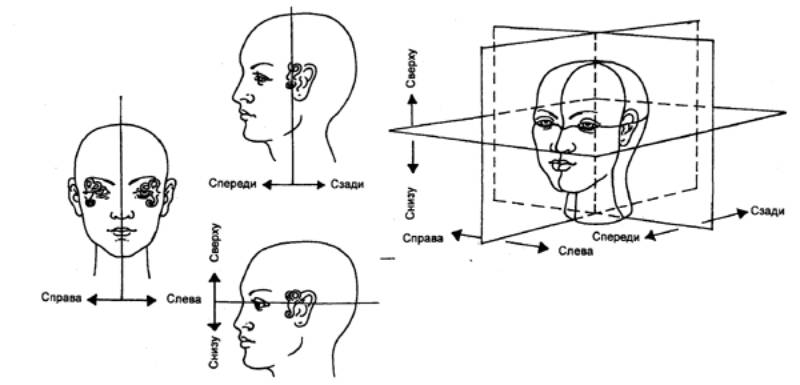 — проекционная; слева — левое полушарие; справа — правое; жирные стрелки —