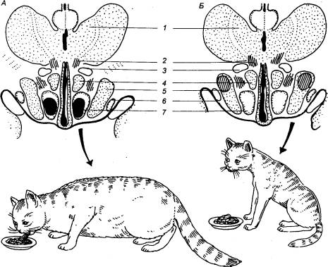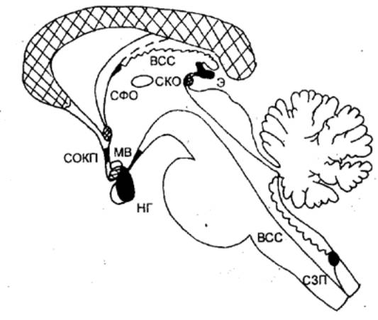 — транскаллозальные (через мозолистое тело) влияния; 2,7, 10 — восходящие афферентные
