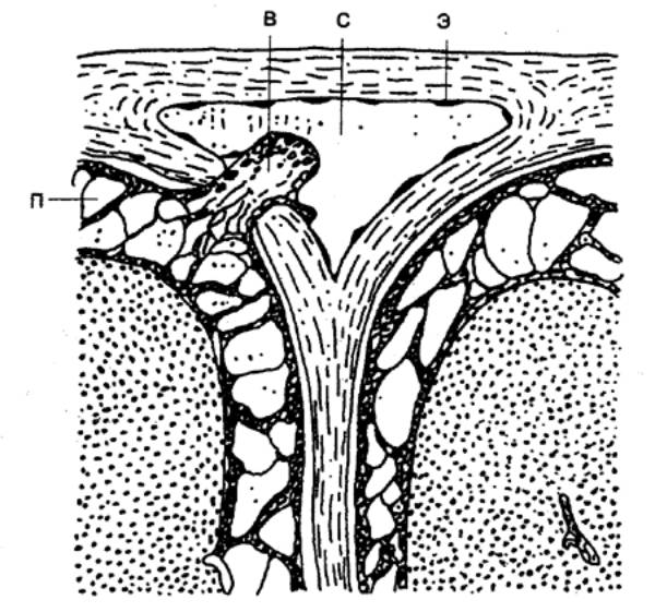 Рис. 3.57 Схема межполушарных взаимоотношений (по Бианки) Вверху — ассоциативная кора, внизу