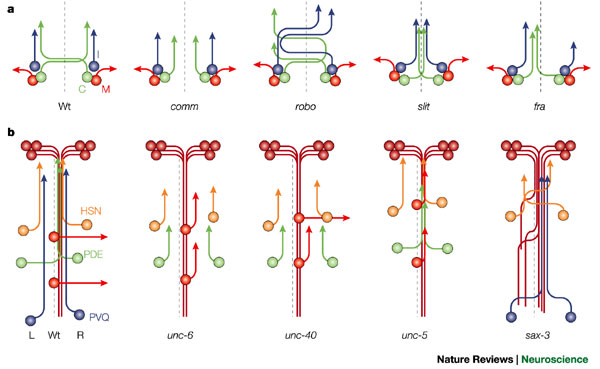 Axon pathways at the CNS midline of Drosophila and Caenorhabditis elegans. a Simplified schematic of the trajectories taken by commissural (C, green), ipsilateral (I, blue) and motor (M, red) neurons in the Drosophila central nervous system (CNS). In the wild-type (Wt) embryo, most CNS axons extend along a commissural pathway and cross the midline (dashed line) in one of two commissural axon tracts. These axons cross the midline only once. The ipsilaterally projecting axons extend on one side of the CNS only, whereas the motor neurons extend out to the periphery either on their own side of the CNS or after crossing the midline (not shown). The Drosophila CNS is bilaterally symmetrical, with the same organization of neurons on either side of the midline. In commissureless (comm) mutants, the C neurons fail to cross, whereas in the robo mutant, I axons can cross the midline and C axons can recross, resulting in whorls of axons at the midline. In the absence of slit, all CNS axons extend towards the midline region and are unable to leave. When frazzled (fra) (or both netrin genes) is removed some axons fail to cross the midline, and breaks appear in the longitudinal tracts. b | Simplified schematic of the trajectories of some neurons in the C. elegans ventral nerve cord (VNC). The C. elegans VNC is asymmetric, with many more axons running in the right fascicle (R) than in the left fascicle (L). Many axons enter the VNC from the anterior or posterior end of the tract; for example, the AV (brown) or PVQ (blue) neurons. Other axons join the VNC along its length; for example, the HSN (orange) and PDE (green) axons, and they might extend contralaterally (PDEL) or ipsilaterally (PDER) once in the VNC. Motor neurons, such as DA5 and DA6 (red), have their cell bodies at the ventral midline (dashed line), and they extend dorsally away from the VNC. In unc-6 mutants, the D neurons fail to extend away from the VNC, and the PDE and HSN neurons fail to extend to the VNC. Mutations in unc-40 primarily affect the axons extending to the VNC, but they can also disrupt extension away from the ventral midline. In the absence of unc-5 activity, the D motor neurons are unable to extend dorsally. Mutations in sax-3 cause a VNC phenotype, where axons from the AV, HSN or PVQ neurons fail to remain in their fascicle and inappropriately cross the midline. Во время эмбрионального развития аксоны должны преодолеть значительные расстояния, чтобы достичь своих конечных мишеней. Пониманию этого процесса в значительной степени способствовали исследования на беспозвоночных моделях. Такие организмы как Drosophila и C. elegans оказались особенно полезными из-за их относительно просто устроенной нервной системы и возможности проведения точного генетического анализа.