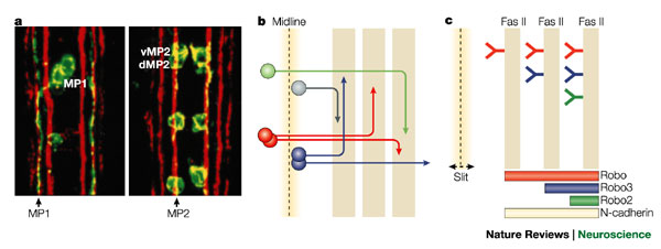 Ключевой стратегией во время исследования нахождения аксонами своего пути является нарушение пути аксона к мишени между клетками-ориентирами (guidepost), существование которых было обнаружено в почке (зачатке) конечности кузнечика. Важными посредниками во взаимодействии между клетками-ориентирами и аксонами являются нетрин (netrin) и его рецепторы. Генетические исследования позволили очертить контуры сигнального каскада, опосредующего действие нетрина. Roundabout (Robo) и Slit формируют часть связанной между собой сигнальной системы, являющейся критической в процессе нахождения аксоном своего пути. Их главная роль заключается в регулировании (упорядочивании) средней линии (midline), пересекаемой аксонами в нервной системе Drosophila. Серия генетических исследований позволила выявить каскад, который может опосредовать их эффект.