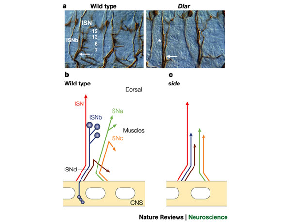 Motor neuron axon pathways in Drosophila. a | Abdominal motor axon projections in the wild type and in a Dlar mutant. Wild-type and Dlar motor neuron branches as seen in filleted stage 17 embryos. The intersegmental nerve b (ISNb) defasciculates from the ISN and innervates ventral longitudinal muscles 6, 7, 12 and 13. In Dlar mutants, the ISNb fails to defasciculate from the ISN (arrowhead) and does not innervate the ventral longitudinal muscles126. The asterisk marks the position where ISN and ISNb can be distinguished as separate fascicles. ISNb, intersegmental nerve b. Reproduced, with permission, from Ref. 123 © Elsevier Sciences (1996). b | Schematic diagram of wild-type motor axon projections. Each main nerve branch is shown in a different colour as it emerges from the exit junction outside the central nervous system (CNS). In wild-type motor axons, the ISN (red) and SN (orange/green) defasciculate into five pathways that innervate the muscle fibres. The SNa (green) and SNc (orange) pathways emerge from the SN root and the ISN (red), ISNb (blue) and ISNd (brown) pathways arise from the ISN root. c | side mutants display an extreme bypass phenotype. In side mutants, as in beat and Dlar mutants, axons from the main motor axon pathways fail to defasciculate at choice points and do not innervate most of the ventral musculature.