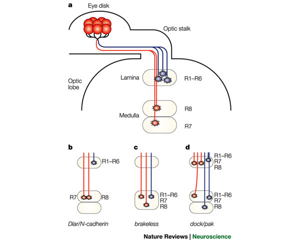 Projections of R-cell axons to targets in the optic lobe. a | A single ommatidium containing eight R-cell neurons is shown. R-cell axons project through the optic stalk into the optic lobe, where they contact their targets. R1–R6 axons (blue) stop at their target layer in the lamina. The R7 and R8 axons (red) continue into the underlying medulla, where they stop in two distinct layers. b–d | Schematic representations of various R-cell mutant phenotypes. b | In Dlar and N-cadherin mutants R7 and R8 terminate in the R8 region. c | In the absence of Brakeless, R1–R8 all terminate in the medulla. d | In dock and pak mutants, uneven axon bundles exit the optic stalk towards the lamina. Most fibres follow abnormal paths, with R1–R6 failing to terminate in the lamina and innervating the medulla. As a result, some regions are hyperinnervated, whereas others remain uninnervated.