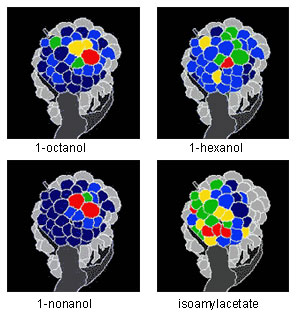 В мозгу пчелы анализом запахов занимается антеннальная доля, состоящая из множества комочков-гломерул. Каждая гломерула состоит из множества нейронов, часть которых может реагировать на тот или иной запах. Каждому запаху соответствует уникальное распределение уровня активности гломерул: от фонового (темно-синий) до максимального (красный). На рисунках — ответы антеннальной доли на запахи различных химических веществ: октанола, гексанола, нонанола и изоамилацетата (изображение с сайта www.neurobiologie.fu-berlin.de)
