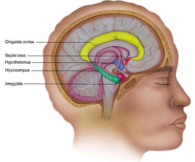 Особую роль в процессах памяти играет так называемая лимбическая система мозга: таламус (образование в центре), амигдала (шарик на толстом конце С-образной структуры), гиппокамп (толстая часть С-образной структуры) и мамиллярные тела (шарики на тонком конце). Эти структуры, лежащие в глубине каждого из полушарий, играют также ключевую роль в формировании эмоций (изображение с сайта www.mhhe.com)