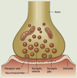 Основной элемент мозга — синапс. Возбуждение одного нейрона высвобождает молекулы нейромедиатора (красные шарики), которые пересекают синаптическую щель и связываются с рецепторами (ямки), что изменяет состояние мембраны второго нейрона (изображение с сайта www.ashingtonhigh.northumberland.sch.uk)