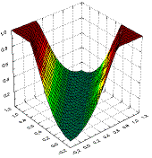 Сеть, содержащая один промежуточный слой, строит несколько сигмоидных склонов - по одному для каждого скрытого элемента, - и затем выходной элемент комбинирует из них "возвышенность". Эта возвышенность получается выпуклой, т.е. не содержащей впадин. При этом в некоторых направлениях она может уходить на бесконечность (как длинный полуостров). Такая сеть может моделировать большинство реальных задач классификации. На рисунке ниже показана поверхность отклика, полученная многослойным персептроном для решения задачи исключающего или: хорошо видно, что она выделяет область пространства, расположенную вдоль диагонали.