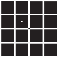 С помощью этого рисунка вы сможете «увидеть» фиксационные движения своих глаз. Смотрите на черную точку в центре изображения в течение минуты, затем посмотрите на белую точку внутри черного квадрата. Обратите внимание на то, что темный послеобраз белого перекреста находится в непрерывном движении. Это и есть фиксационные движения глаз |