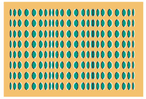 ИЛЛЮЗОРНОЕ ДВИЖЕНИЕ. Позвольте своим глазам «блуждать» по изображению вверху, и вскоре вы увидите, как по нему катятся три «волны». Но если вы зафиксируете взгляд на одном из зеленых пятен в центре картинки, то иллюзорное движение замедлится или даже прекратится. Авторы предполагают, что фиксационные движения глаз необходимы для восприятия данной иллюзии, хотя они еще не знают, как именно это происходит |