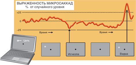 Несколько лет назад в Неврологическом институте Бэрроу мы поставили перед собой задачу определить связь между микросаккадами и способностью видеть с помощью совершенно иной методики. В своих экспериментах мы просили добровольцев выполнять определенную версию теста Трокслера. Испытуемые должны были фиксировать взглядом небольшую точку и сообщать нажатием кнопки, видят ли они неподвижный объект на периферии поля зрения или нет. Действительно, объект временами как будто исчезал, а затем появлялся снова, при этом мы регистрировали фиксационные движения глаз с помощью высокоточной видеосистемы.