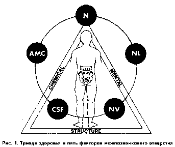 И, наконец, еще в 1910 году D.D. Palmer [12] выдвинул концепцию о "триаде здоровья" (Triad of Health). Соответственно этой концепции организм может быть представлен в виде равностороннего треугольника (рис. 1), стороны которого представляют структурную, химическую и психическую составляющие. Значимость каждой из них в сохранении гомеостаза и адаптационных реакциях организма равновелика. Если в системе взаимодействия этих трех составляющих имеется нормальный баланс, то человек здоров, но, если хотя бы в одной из составляющих имеется любая патология или дисфункция, возникает дисбаланс во всей системе, что требует диагностики и коррекции всех трех составляющих. Каждой составляющей триады здоровья занимаются разные специалисты: структурной - остеопаты, хиропрактики, мануальные терапевты, физиотерапевты, массажисты и др., химической - диетологи, аллопаты, травники, гомеопаты и др., психической - психиатры, психотерапевты, психологи, священники, астрологи и др. Важно, что воздействие на каждую составляющую может обусловить терапевтический эффект на две другие.